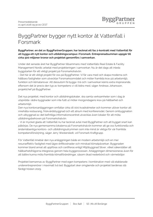 ByggPartner, en del av ByggPartnerGruppen, har tecknat ett fas 2-kontrakt med Vattenfall för att bygga ett nytt kontor och utbildningscampus i Forsmark. Entreprenadsumman uppgår till cirka 500 miljoner kronor och projektet genomförs i samverkan.