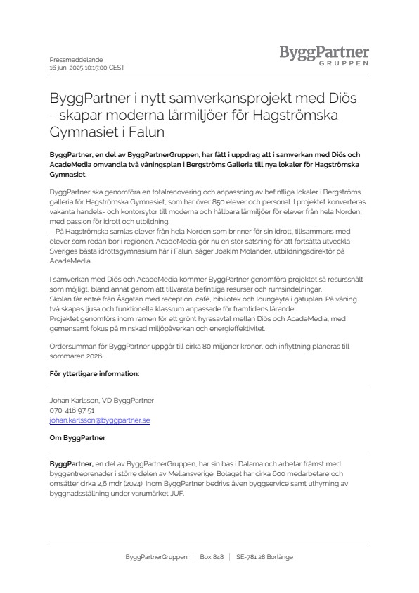 ByggPartner ska genomföra en totalrenovering och anpassning av befintliga lokaler i Bergströms galleria för Hagströmska Gymnasiet, som har över 850 elever och personal. I projektet konverteras vakanta handels- och kontorsytor till moderna och hållbara lärmiljöer för elever från hela Norden, med passion för idrott och utbildning.
