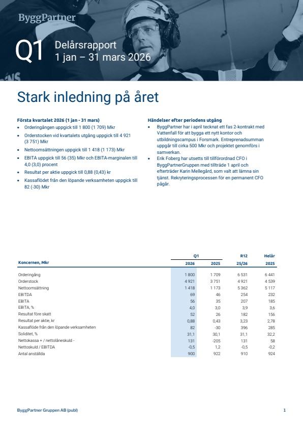 Det är med glädje jag konstaterar att vår positiva utveckling fortsätter även i det första kvartalet 2026. Kvartalet har präglats av en stark orderingång, rekordhög orderstock, omsättningstillväxt om 21%, EBITA som ökar med 60% till 56 Mkr, en ökad EBITA-marginal till 4,0% (3,0%), samt ett fortsatt mycket starkt kassaflöde om +82 Mkr (-30 Mkr).