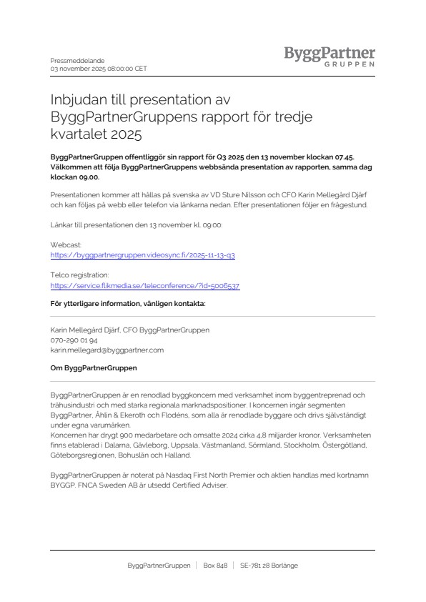 ByggPartnerGruppen offentliggör sin rapport för Q3 2025 den 13 november klockan 07.45. Välkommen att följa ByggPartnerGruppens webbsända presentation av rapporten, samma dag klockan 09.00.