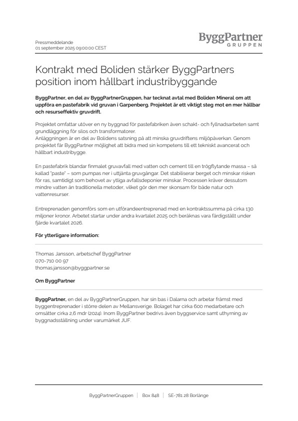 ByggPartner, en del av ByggPartnerGruppen, har tecknat avtal med Boliden Mineral om att uppföra en pastefabrik vid gruvan i Garpenberg. Projektet är ett viktigt steg mot en mer hållbar och resurseffektiv gruvdrift.