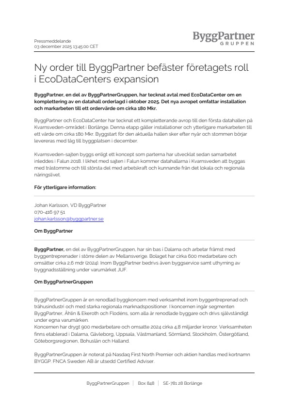 ByggPartner, en del av ByggPartnerGruppen, har tecknat avtal med EcoDataCenter om en komplettering av en datahall orderlagd i oktober 2025. Det nya avropet omfattar installation och markarbeten till ett ordervärde om cirka 180 Mkr.